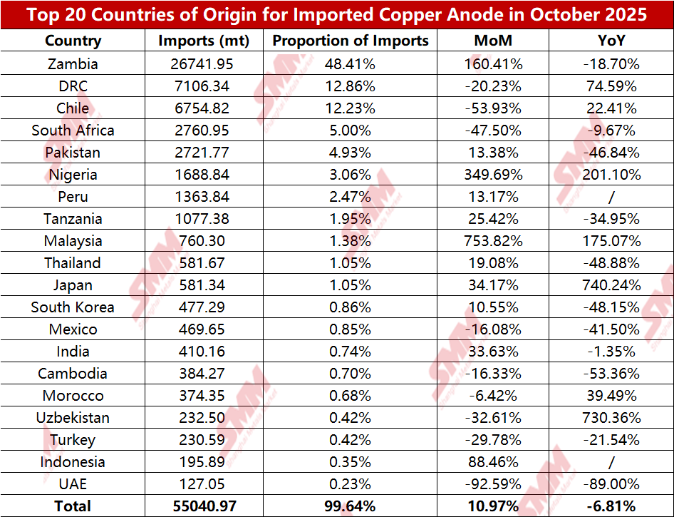By country, China imported 26,700 mt of copper anode from Zambia in October 2025, accounting for 48.41% of total imports, up 160.41% MoM but down 18.70% YoY. Imports from the DRC totaled 7,100 mt, representing 12.86% of the total, down 20.23% MoM but up 74.59% YoY. Imports from Chile reached 6,800 mt, accounting for 12.23%, down 53.93% MoM but up 22.41% YoY.