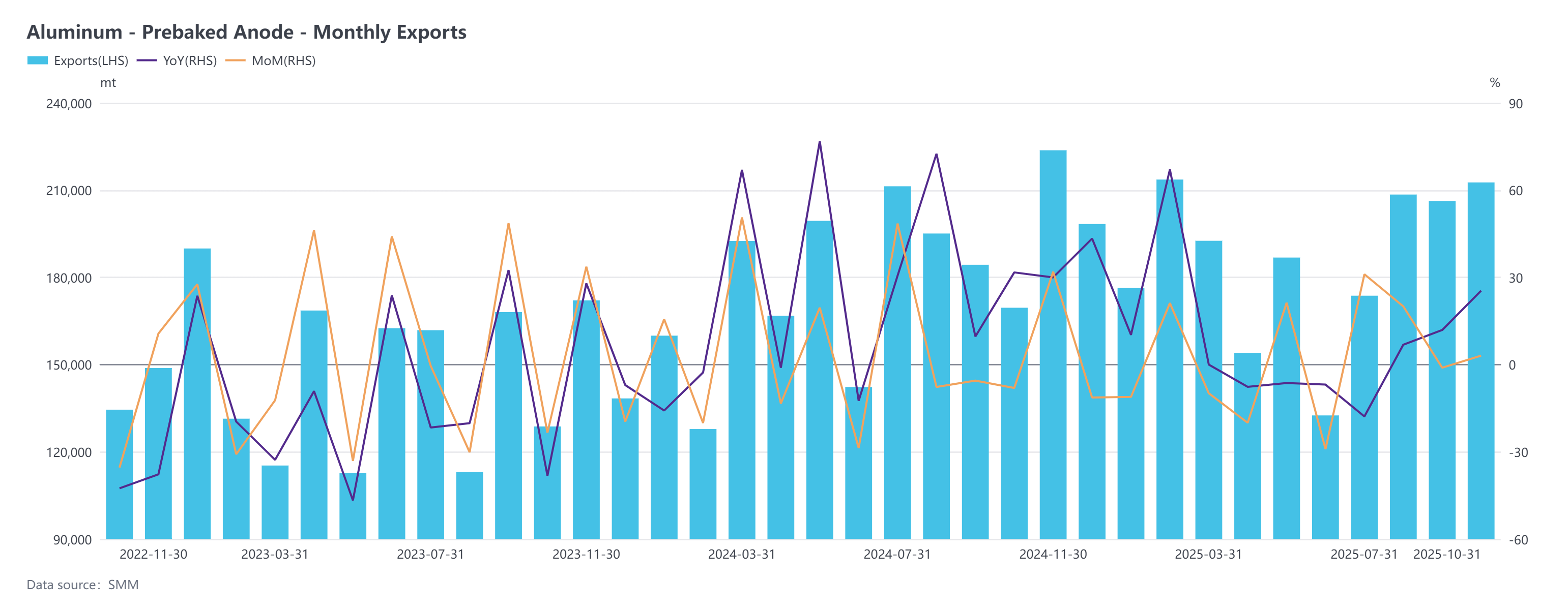According to customs data, China's prebaked anode exports totaled 212,700 mt in October 2025, up 25.41% YoY and up 3.09% MoM. Rough calculations show the average export price of prebaked anode was about $774/mt in October 2025, up 21.98% YoY and up 0.20% MoM. Cumulative prebaked anode exports from China reached 1.8572 million mt in 2025, up 6.17% YoY.