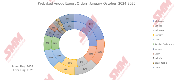 In terms of export destinations, China's main prebaked anode export countries in 2025 were Malaysia, Canada, and Indonesia, together accounting for about 50% of total exports. Exports to Malaysia totaled 413,500 mt (22% of total), down 11.02% YoY; exports to Canada were about 267,300 mt (15% of total), up 19.36% YoY; exports to Indonesia were about 245,400 mt (13% of total), up 71.89% YoY.