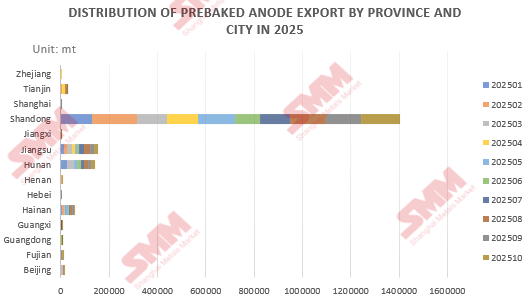 Domestically, prebaked anode exports in 2025 were concentrated in Shandong, Jiangsu, and Hunan. Shandong's cumulative exports totaled 1.4035 million mt, accounting for 76% of the total and ranking first; Jiangsu's cumulative exports were 153,400 mt, accounting for 8%; Hunan's cumulative exports were 141,400 mt, also accounting for 8%.