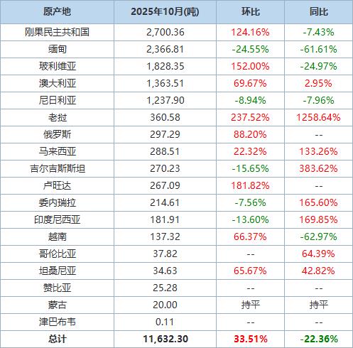 The following is a breakdown of China's tin ore and concentrates imports in October 2025, compiled based on data from the General Administration of Customs website:
