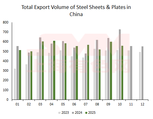 [SMM Sheets & Plates Imports & Exports] China's exports of sheets and plates fell 4% YoY in January-October 2025.