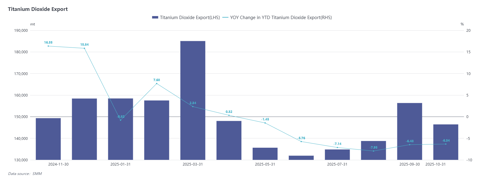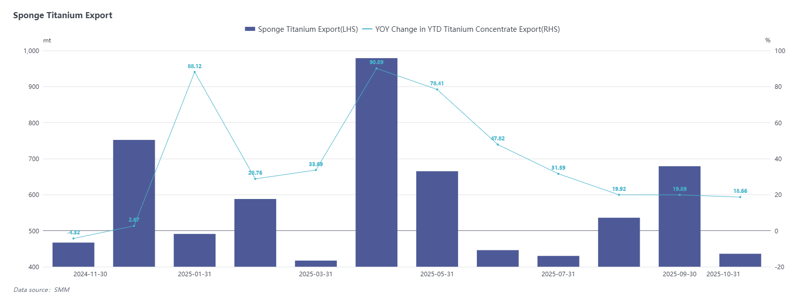 China's titanium market exhibited a pattern of weak supply and demand in October. Upstream titanium concentrate imports fell 16.22% MoM to 374,800 tonnes, as disappointing "Silver October" demand intensified market competition and put downward pressure on prices. Midstream titanium dioxide exports decreased 6.34% MoM to 146,000 tonnes, constrained by high overseas inventories and insufficient manufacturing momentum. Downstream sponge titanium exports fell sharply by 35.79% MoM to 436 tonnes; although cumulative exports maintained year-on-year growth, the short-term demand slowdown was evident.