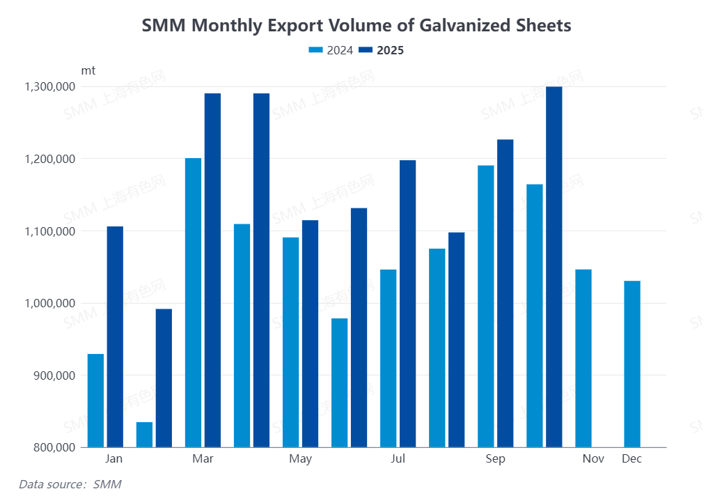 According to the latest customs data, in terms of galvanized sheets, the export volume in October 2025 was 1.2994 million mt, up 5.97% MoM and 11.68% YoY. From January-October 2025, the cumulative export volume of galvanized sheets reached 11.74 million mt, up 10.07% YoY.