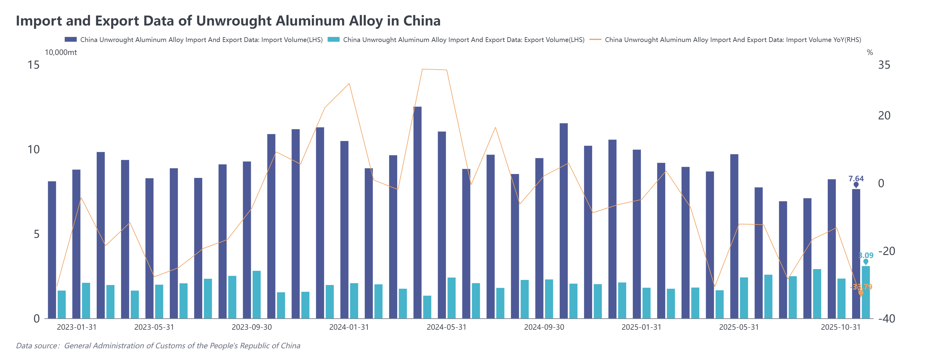 In October 2025, unwrought aluminum alloy imports totaled 76,400 mt, down 33.8% YoY and down 7.1% MoM. Cumulative imports from January to October 2025 reached 841,000 mt, down 16.4% YoY.
