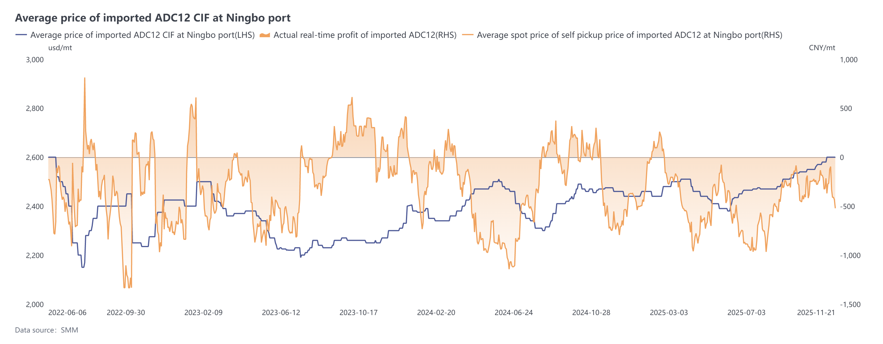 Overall, in October 2025, China's imports of unwrought aluminum alloy declined both MoM and YoY, while exports continued to show significant growth. The primary driver of this trend was the persistent inversion of the aluminum alloy price spread between domestic and overseas markets throughout the year, which directly reduced the cost-effectiveness of imports. Additionally, tight scrap supply and rising demand in Japan, South Korea, and India pushed up local aluminum scrap and alloy ingot prices, attracting Southeast Asian aluminum alloy ingot resources to divert, further suppressing China's import volume. Currently, overseas ADC12 offers remain at $2,600–2,630/mt, with price resilience significantly higher than in the domestic market. The widening of immediate import losses will continue to constrain import willingness. Based on this, imports of unwrought aluminum alloy are expected to remain low in November-December, with full-year imports likely to decline sharply by around 18% YoY.