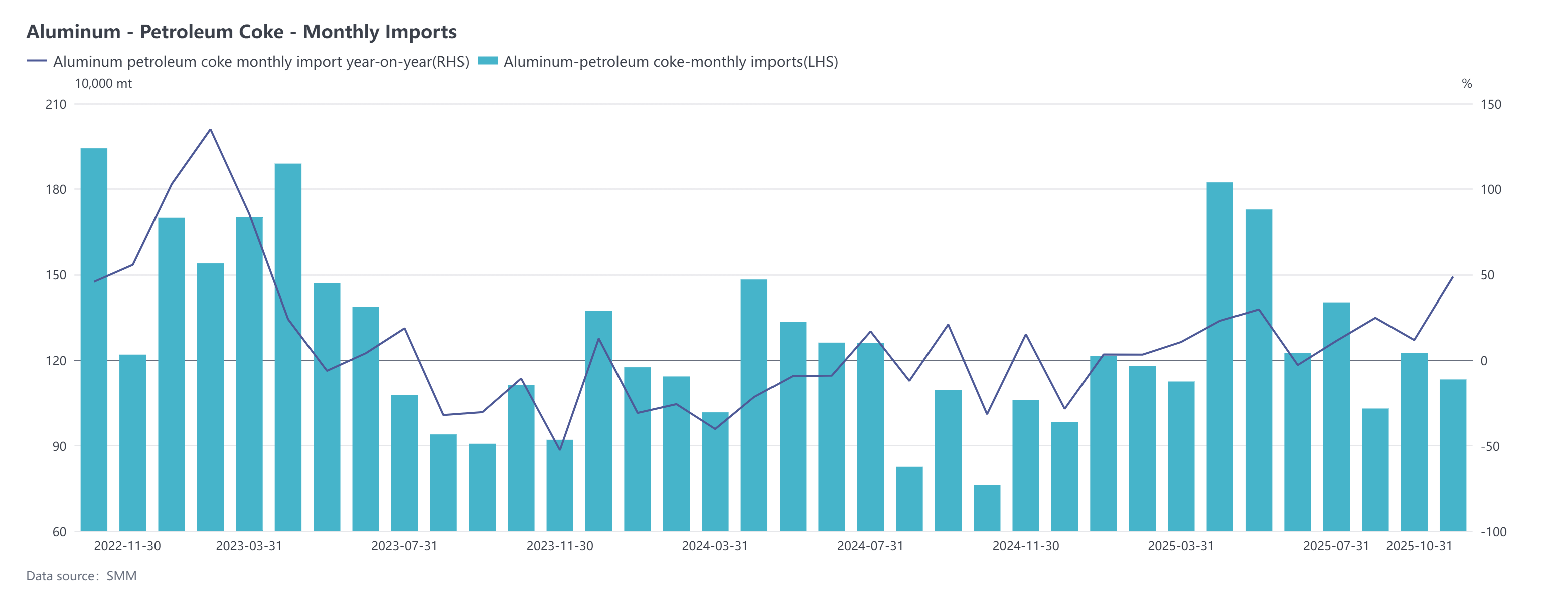 Customs data showed that China's petroleum coke imports in October 2025 reached 1.1324 million mt, down 7.54% MoM but up 48.76% YoY. The estimated average import price for petroleum coke in October was $225.02/mt, up 5.47% MoM and 60.97% YoY. Cumulative petroleum coke imports for January-October 2025 totaled approximately 13.0862 million mt, up 15.24% YoY.