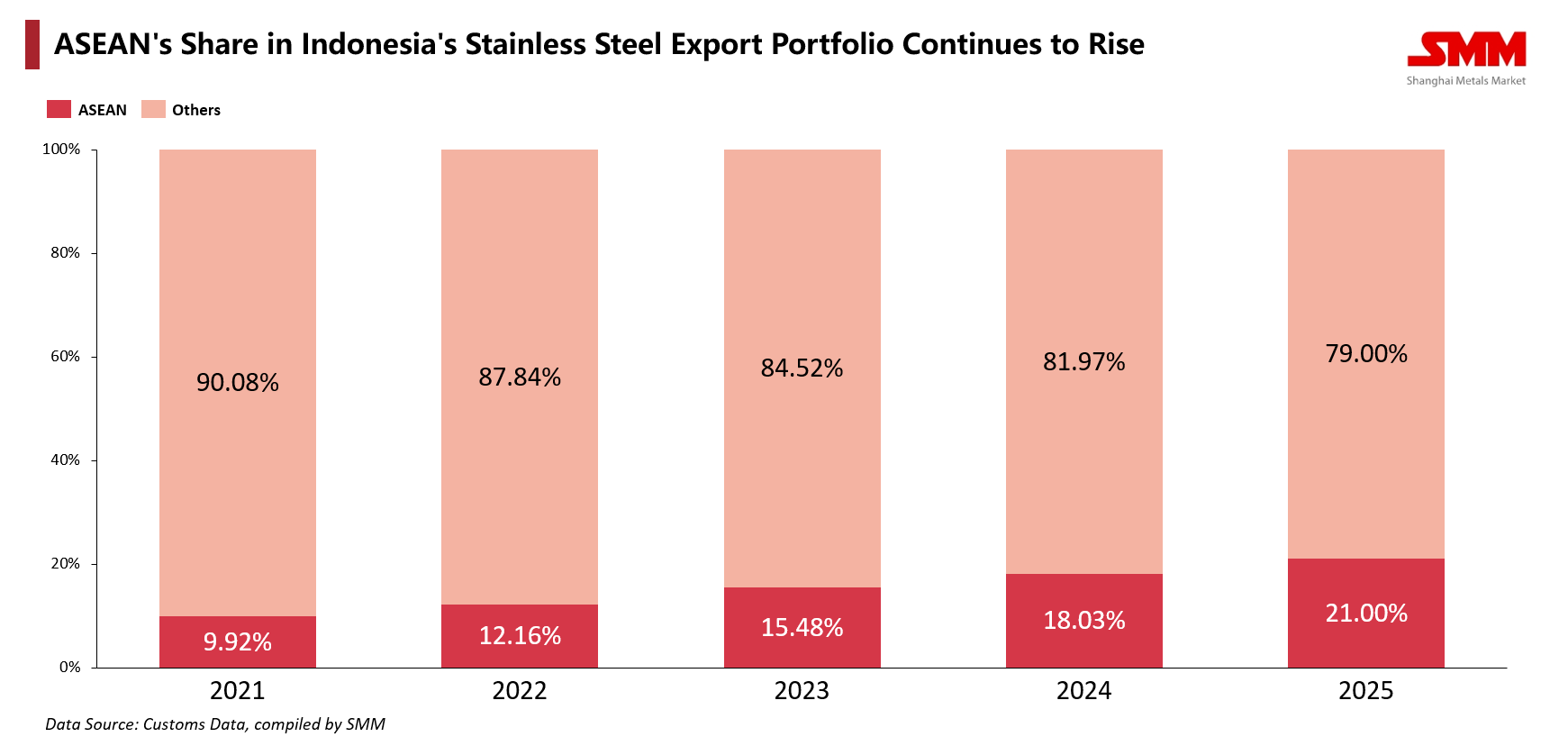 According to SMM statistics, Indonesian stainless steel exports surged to 3.43 million tons in the first three quarters of 2025, with shipments to its Southeast Asian neighbors jumping by 17.21%. More telling is the structural deepening of this dependence: Southeast Asia’s share of Indonesia’s export portfolio has more than doubled from 9.92% in 2021 to 21.00% in 2025. This is not merely trade; it is market capture. With exports to Thailand increasing by 28% and shipments to Malaysia soaring by a staggering 103%, Indonesia has graduated from a mineral supplier to a dominant manufacturer of finished and semi-finished goods, aggressively cannibalizing the market share previously held by established players.