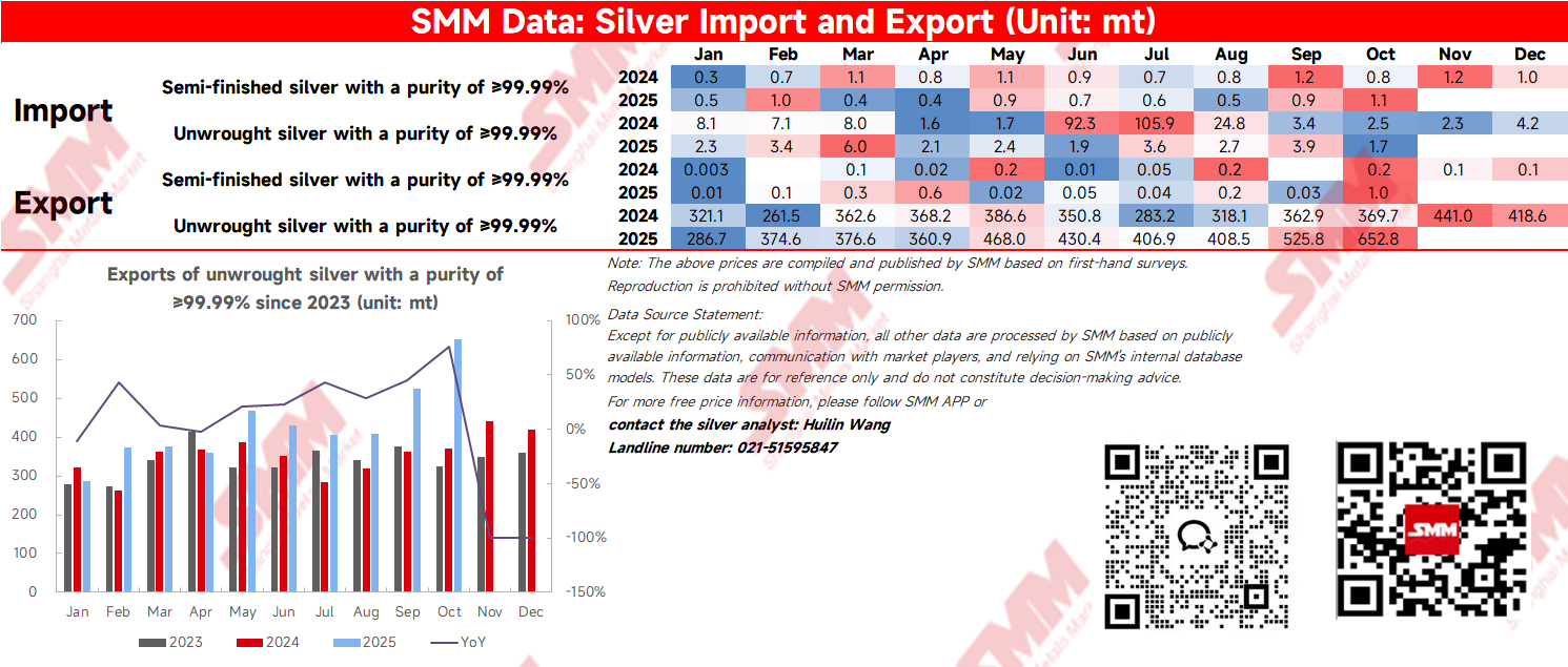 According to customs data, exports of unwrought silver ingots with a purity ≥99.99% reached 652.8 mt in October 2025, up 19.45% MoM and 76.58% YoY. Among these, silver ingots exported under the processing trade amounted to 478.59 mt, accounting for approximately 91.75% of the total. Cumulative silver ingot exports from January to October 2025 totaled 4,291.17 mt, an increase of 21.12% compared to the same period last year.