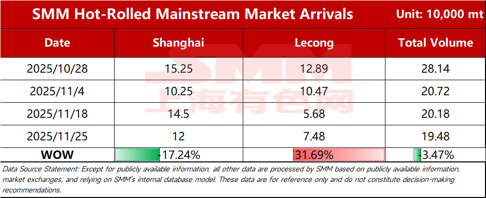 Lecong market: Shipments to Lecong increased WoW. Specifically, the main increase this period came from local mainstream resources; the completion of variety steel production mid-month prompted some mills to increase market supply. Meanwhile, the price spread between south and east China narrowed earlier, leading some mills to adjust shipments. Going forward, as the price spread between south and east China recently narrowed, some mills may further increase shipments. However, considering export orders remain, a more noticeable increase may occur next month. Arrivals are expected to rebound from low levels next week.