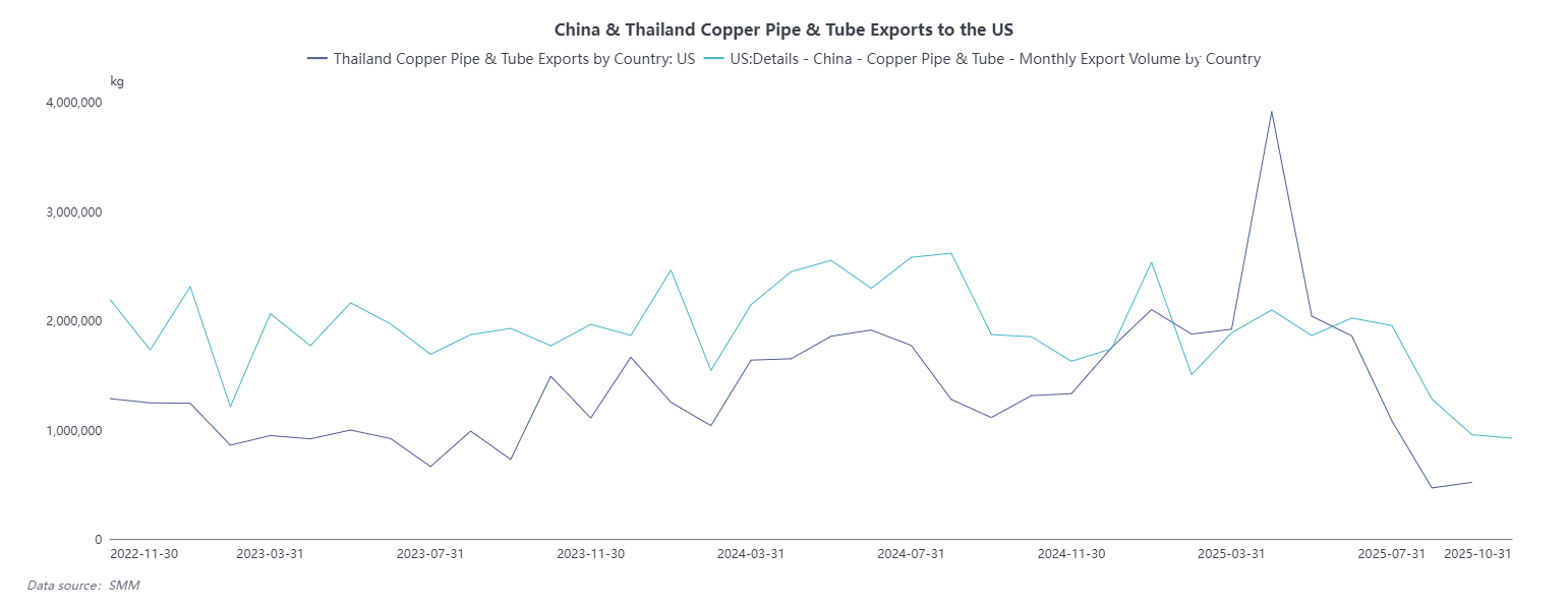 The cumulative growth rate of exports continued to narrow. Copper pipe and tube exports performed positively in H1, but declined steadily after the US imposed tariffs on copper pipe and tube. October is traditionally a peak season for exports, but no significant performance was seen within the year. Observations indicate that exports from both China and Thailand to the US have been declining. It is understood that local copper pipe and tube capacity in the US has been slow to ramp up, keeping local copper pipe and tube processing fees elevated. Copper pipe and tube exports are expected to remain down YoY in the last two months of 2025.
