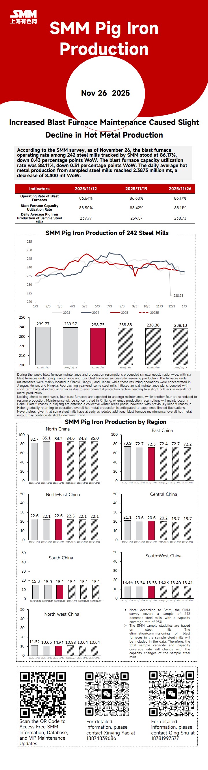 According to the SMM survey, as of November 26, the blast furnace operating rate among 242 steel mills tracked by SMM stood at 86.17%, down 0.43 percentage points WoW.
