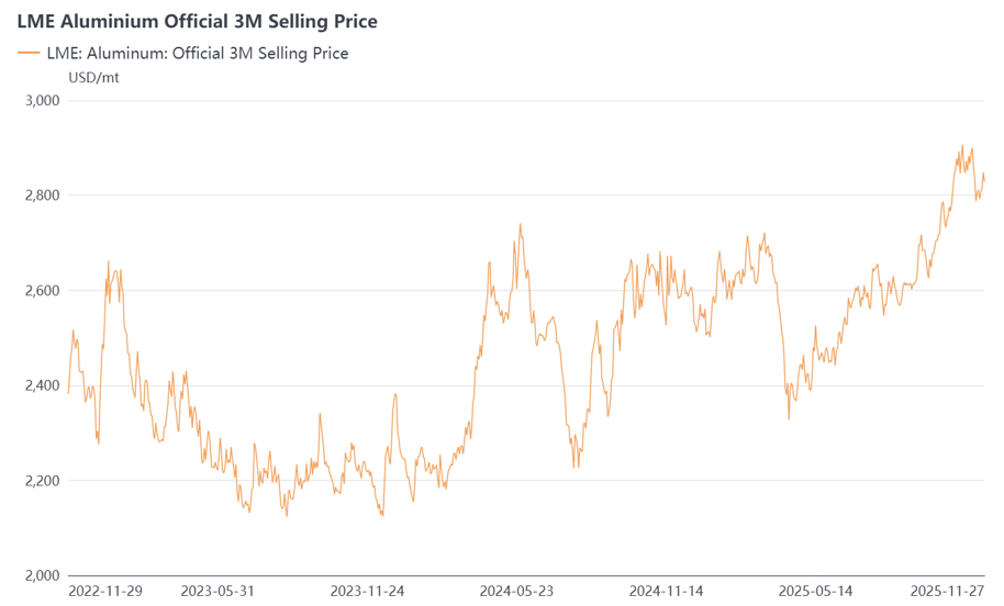 In 2025, LME aluminium prices showed a volatile upward trend. From the beginning of the year to mid-March, prices remained relatively stable, before retreating to around USD 2,400/tonne in late March. After April, the market gradually stabilized and edged higher, until a new round of increases began in late October. By November, aluminium prices were fluctuating in the USD 2,800-2,900/tonne range, marking the highest level since the surge triggered by the Russia–Ukraine conflict in 2022.