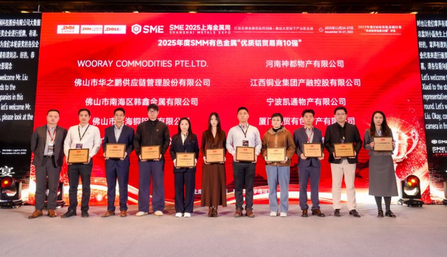On November 25, at the banquet of the Shanghai Metals Expo (SME) 2025, organizedby SMM Information & Technology Co., Ltd. and SMM Trading Center Co., Ltd., SMM held a grand award ceremony for the 2025 SMM Nonferrous Metals "Top 10 High-Quality Aluminum Traders".