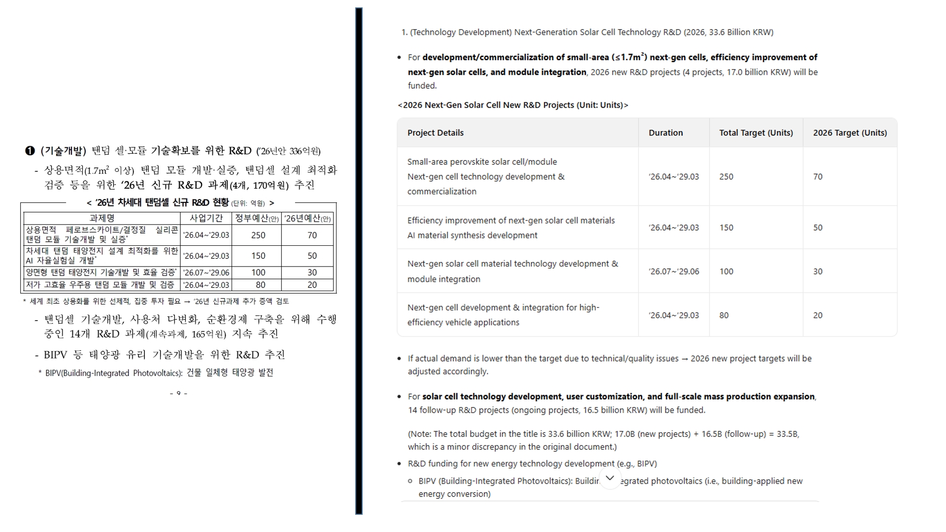 The total 2026 budget of 33.6 billion won will be allocated across three main areas: 17 billion won is designated for four new projects, specifically including 7 billion won for developing and demonstrating perovskite-silicon tandem solar modules suitable for commercial sizes, 5 billion won for establishing an autonomously operating AI laboratory to accelerate the iteration of materials and devices, 3 billion won for tackling double-sided light-receiving tandem cell technology, and 2 billion won for R&D on cost-effective tandem modules for space applications; an additional 16.5 billion won will continue to support 14 ongoing projects to ensure steady progress on existing technology pathways; the remaining 2.2 billion won is specifically earmarked for establishing domestic and overseas standards and certification systems, concurrently carrying out initial market cultivation work to lay the foundation for subsequent large-scale commercial use.