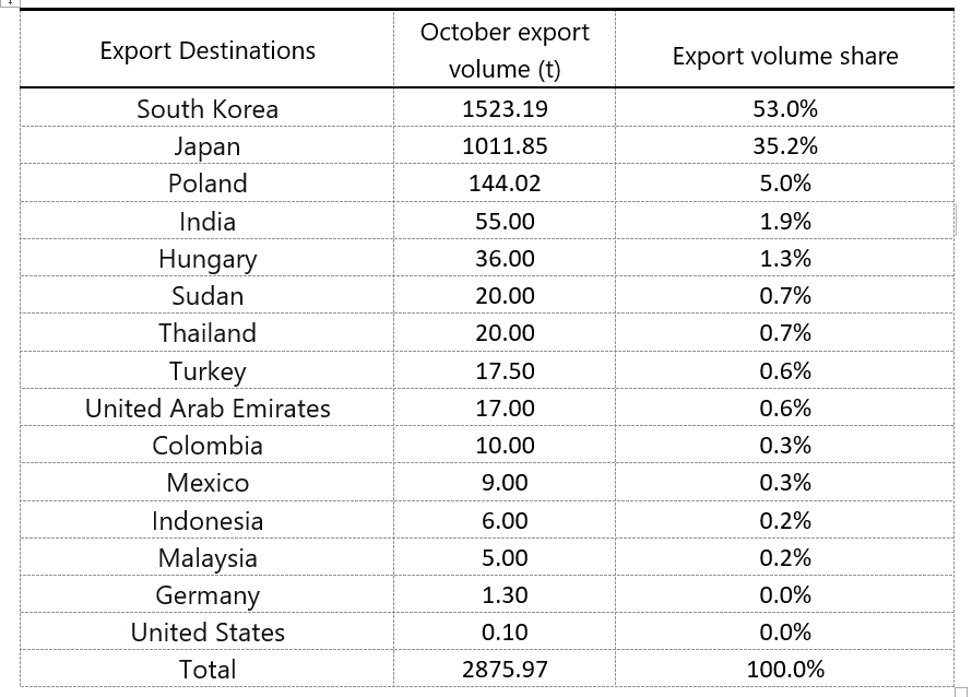 By country, exports to South Korea and Japan collectively accounted for 88% of the total export volume. Exports to South Korea stood at 1,523 tonnes, down 67% month-on-month and 74% year-on-year. Exports to Japan totaled 1,012 tonnes, reflecting a decrease of 41% from September and a 40% drop compared to the same period last year.