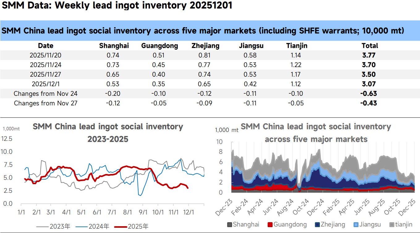 SMM Dec 1: According to SMM, as of December 1, the total social inventory of lead ingots across five regions stood at 30,700 mt, down 6,300 mt from November 24 and 4,300 mt from November 27, reaching a near one-month low.