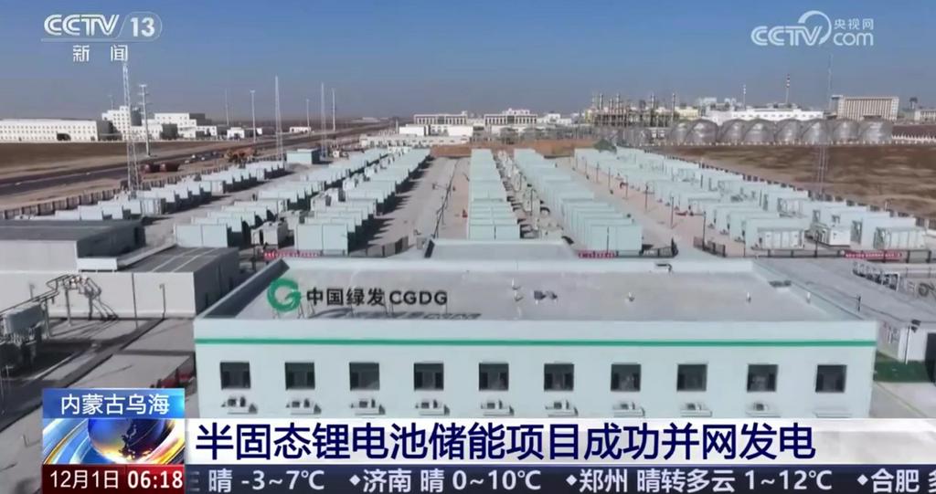 On December 1, 2025, according to CCTV News, China Green Development Group's 200 MW/800 MWh semi-solid-state battery energy storage project in Wuhai, Inner Mongolia, was connected to the grid, signaling the beginning of large-scale commercial operation for semi-solid-state energy storage technology. The project covers an area of approximately 100 mu and is equipped with 160 ESS battery cabins and 40 integrated converter and step-up cabins.