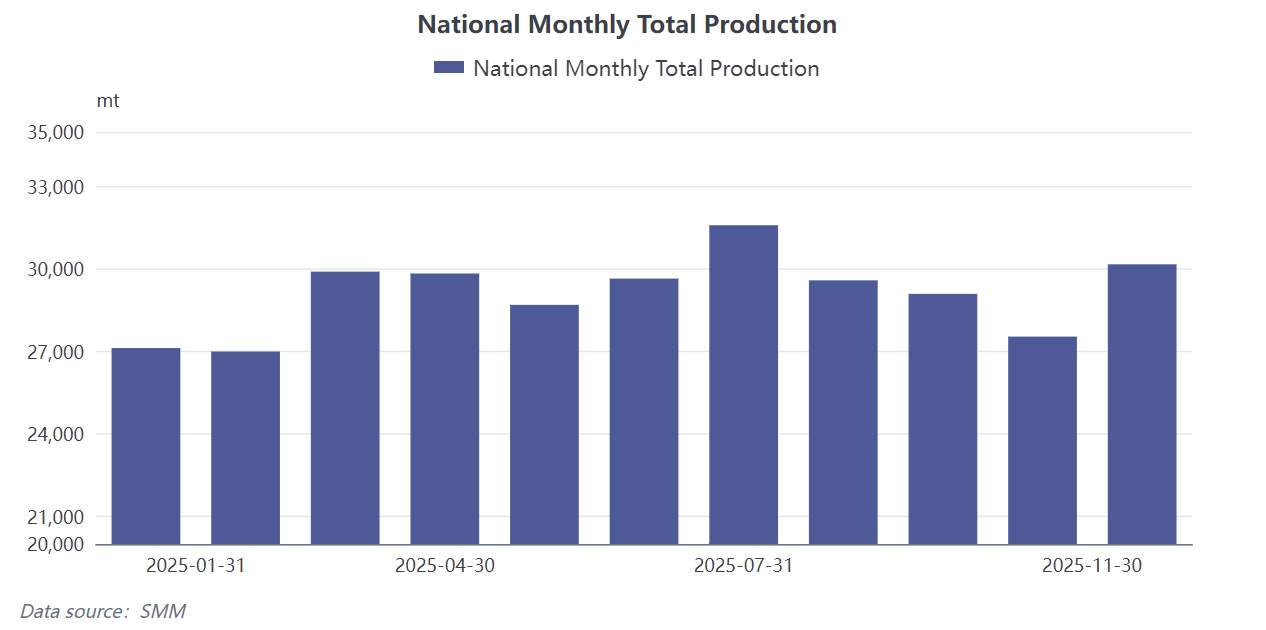 NdFeB production in December is expected to pull back to 29,540 mt, with the operating rate dropping to 69.1%, down approximately 2% MoM. This adjustment is primarily driven by three restraining factors: