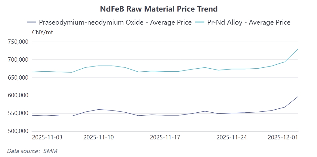 Recent sharp price increases in Pr-Nd have significantly impacted the NdFeB permanent magnet industry chain. On the first day of December, spot Pr-Nd oxide quotes surged by 30,000 yuan/mt to 596,500 yuan/mt in a single day, while Pr-Nd alloy prices rose by 36,500 yuan/mt to 730,000 yuan/mt. This price surge is primarily driven by tightening supply expectations: rare earth supply is becoming constrained, while demand from sectors such as wind power and NEVs remains robust, leading to a pronounced supply-demand imbalance.
