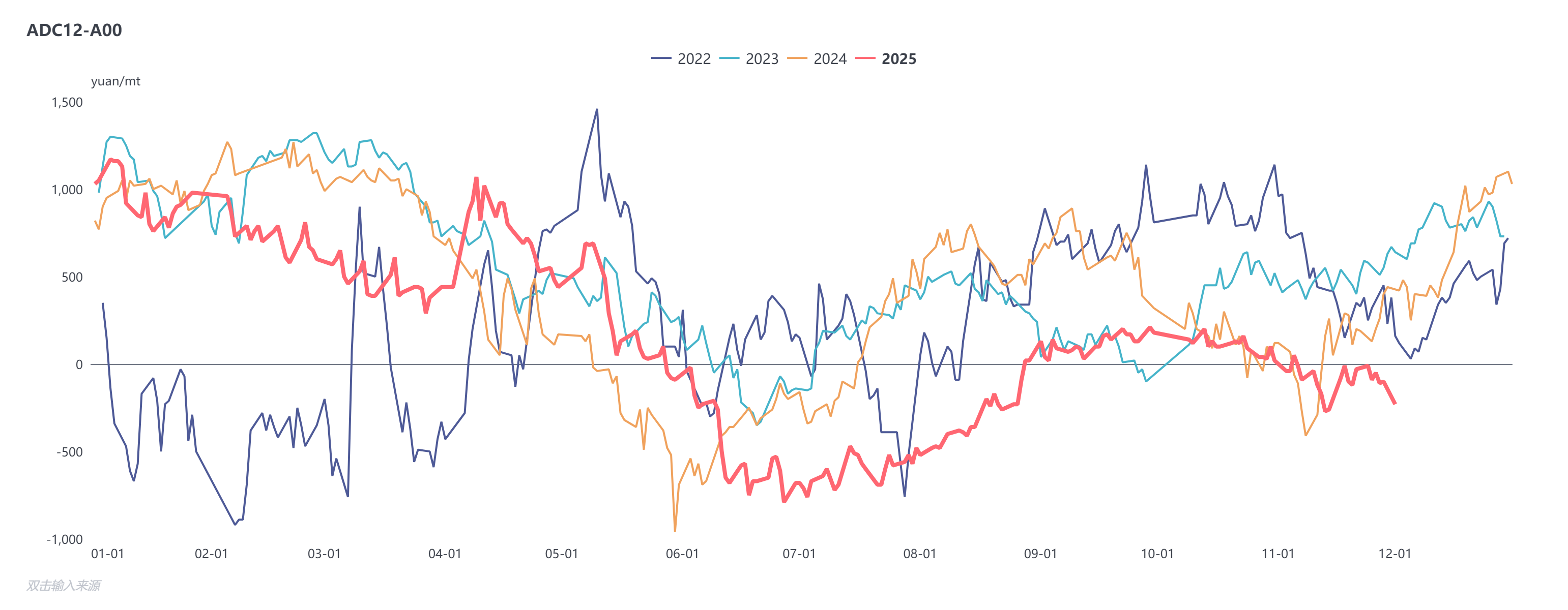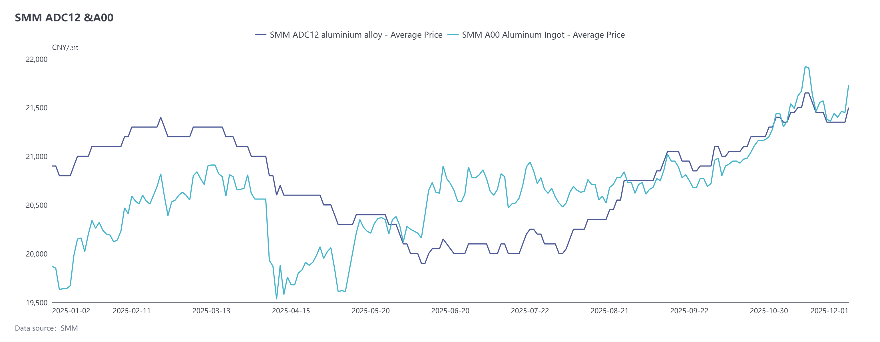 In the spot market, the SMM ADC12 price trend rose initially then fell, with overall volatility weaker than that of aluminum prices. ADC12 shifted to a discount against A00 aluminum, with the discount widening early in the month and narrowing by month-end. Later, influenced by another surge in aluminum prices in December, the discount widened again, with the price spread between the two reaching its lowest level in nearly four years. As of December 2, the SMM ADC12 offer increased by 100 yuan/mt from early November to 21,500 yuan/mt, and the average price for November was up 1.4% MoM. Throughout the month, prices were influenced by a mix of cost support and demand changes, maintaining a pattern of holding up well.