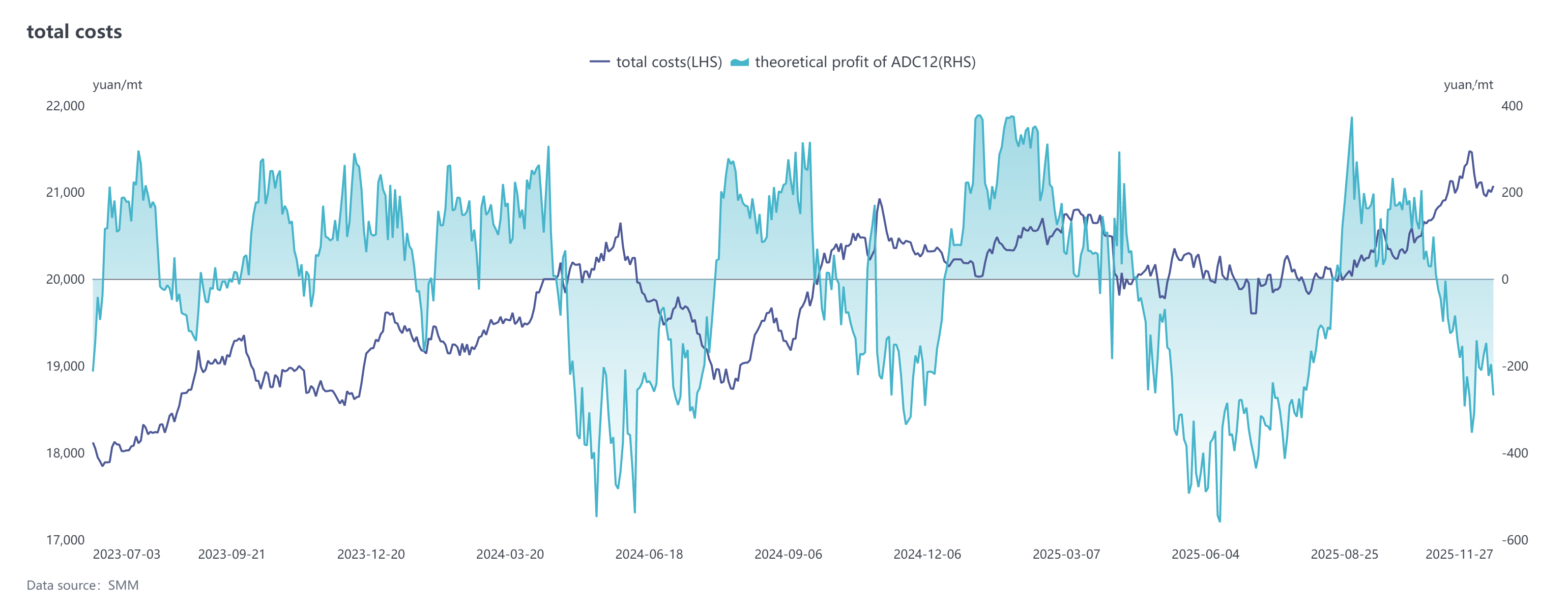 Cost side, the cost trend of secondary aluminum alloy in November was mainly driven by tight aluminum scrap supply. Spurred by the rapid rise in aluminum prices, aluminum scrap prices followed with a notable increase, causing a sharp rise in cost pressure for secondary aluminum alloy producers and pushing the industry into losses. Although subsequent aluminum price pullbacks led aluminum scrap prices to drop back slightly, due to the persistent tight supply situation and traders' reluctance to sell, cost support remained strong. In November, the per-mt cost of aluminum scrap for ADC12 rose to 19,008 yuan, up 2.4% MoM, accounting for nearly 90% of the total cost. Meanwhile, average prices of auxiliary materials such as silicon and copper, as well as natural gas prices, all rose, further pushing up the overall cost of secondary aluminum alloy. As the price increase of finished alloy ingots lagged, enterprise losses widened. Additionally, processing fees for aluminum alloy products with higher copper content, such as A380, continued to increase, with the premium over ADC12 expanding to 1,400-1,600 yuan/mt. Due to persistently high costs, enterprises generally adopted an order-based production model, largely maintaining low inventory levels.