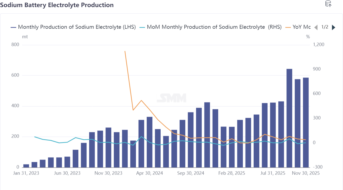 In November, sodium-ion battery electrolyte production increased by 2% MoM and 38% YoY, showing steady expansion in production scale. Prices remained stable. Compared to the sharp price surge of LiPF6, a key raw material for lithium battery electrolyte, the price of NaPF6, a critical raw material for sodium-ion battery electrolyte, remained stable, supporting industry profitability.