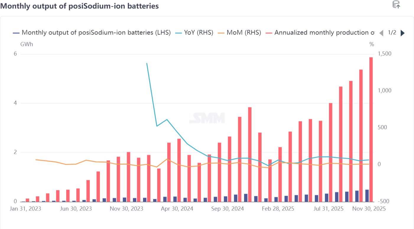 Layered oxide O3 routes also maintained growth momentum. With the initial implementation of layered oxide technology in heavy truck projects, the demand for cathode raw material reserves continues to be released, along with stable demand from small-scale ESS applications, keeping the production of layered oxide cathodes at a high level in November. Looking ahead to December, based on current order support, expectations for sodium-ion cathode production are optimistic, with a forecasted 3% MoM growth and a 139% YoY increase.