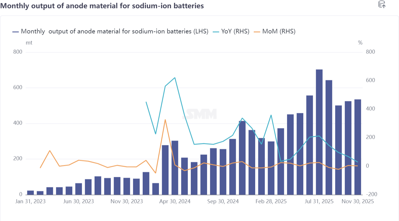In November, the production of sodium-ion anode materials increased 5% MoM and 68% YoY, although the growth rate was lower than that of cathodes, the effects of industry adjustments are gradually becoming evident. This month, hard carbon anode enterprises carried out a series of optimization adjustments focusing on production raw materials, cost control, and product pricing, driving marginal improvements in shipment conditions. The industry consensus is clear, the sector is still in its nurturing stage, and it is not advisable to prematurely fall into price involution; quality improvement and technological iteration remain the core directions.