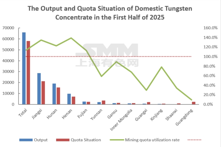 In previous years, the quota system was plagued by loopholes such as overproduction and inadequate supervision of associated tungsten mines. However, 2025 marks a crucial turning point in quota trends, with significantly strengthened regulatory oversight and almost zero possibility of industry overmining. According to the first batch of tungsten mining quotas, the three major domestic production regions—Jiangxi, Hunan, and Henan—accounted for 43,900 tons, or 75.7%, of the total domestic quota. Actual output in these three provinces in the first half of this year basically fully utilized the quotas, with some mines facing shortages. In contrast, regions such as Yunnan, Guangdong, and Guangxi have low quota utilization rates due to insufficient mine operation. Regional quota allocation issues may restrict the 2025 actual output from exceeding the total quota, exacerbating supply tightness.