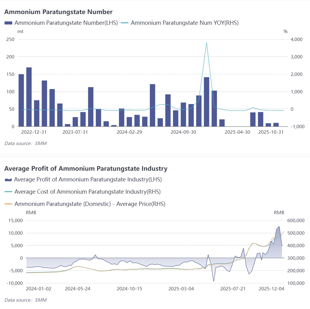 November witnessed a significant shift in the tungsten market: APT smelters turned from loss to profit, benefiting not only from the transformed supply-demand structure in the APT industry but also reflecting the smooth transmission of high prices. According to SMM data, domestic APT output in November 2025 increased by 1.5% month-on-month but fell by approximately 6% year-on-year. The operating rate of the APT industry in October was about 70.4%, a month-on-month increase of 0.3 percentage points. The average monthly price of 65% black tungsten concentrate in November 2025 was 321,300 yuan per standard ton, translating to an average APT production cost of around 465,000 yuan per ton. The industry thus shifted to profitability, with an average monthly profit of approximately 8,560 yuan per ton in November.