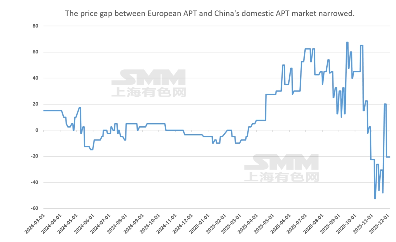 As the world’s leading tungsten producer, China imposed export controls on APT, tungsten carbide, and tungsten powder in February this year, triggering a sharp rise in the overseas tungsten market and a significant premium for APT and other products. However, stimulated by domestic supply-demand imbalances in the second half of the year, domestic tungsten prices surged rapidly, while overseas markets followed suit sluggishly, leading to an internal-external price inversion in the third quarter and a decline in the tungsten premium. In November, driven by factors such as reduced production at Vietnam’s Masan Tungsten and the inclusion of tungsten in strategic metals by the EU and U.S. governments, the overseas tungsten market quickly followed the domestic rally. Nevertheless, terminal order follow-up remains slow, reflecting weak supply and demand, with some prices still lower than domestic levels, leaving room for further increases.
