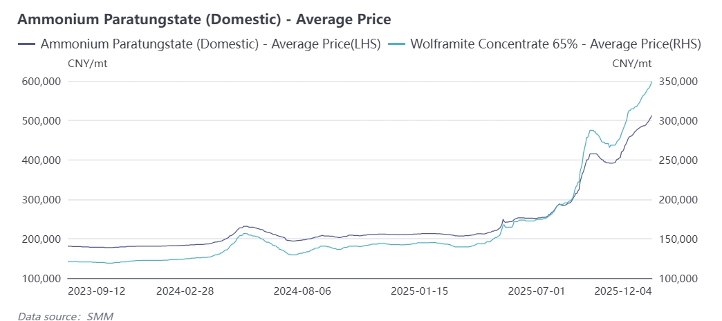 Since late October, the global tungsten market has once again embarked on a unilateral upward trend. As of December 4th, the price of 65% black tungsten concentrate has hit a record high of 350,000 yuan per standard ton, with a cumulative year-to-date increase of 145%. Ammonium Paratungstate (APT) prices have risen to 512,500 yuan per ton, up 143% year-on-year. Tungsten Carbide (WC) powder is quoted at 785 yuan per kilogram, a 152% increase since the start of the year, while tungsten powder stands at 820 yuan per kilogram, surging 160% year-to-date. Driven by the rally in upstream raw materials, the entire tungsten industrial chain has witnessed a synchronized upward movement. Given that the supply-demand imbalance in the tungsten market is unlikely to be resolved in December, the upward trend across the whole industrial chain is expected to continue. SMM analyzes the drivers behind this round of price increases based on the following factors: