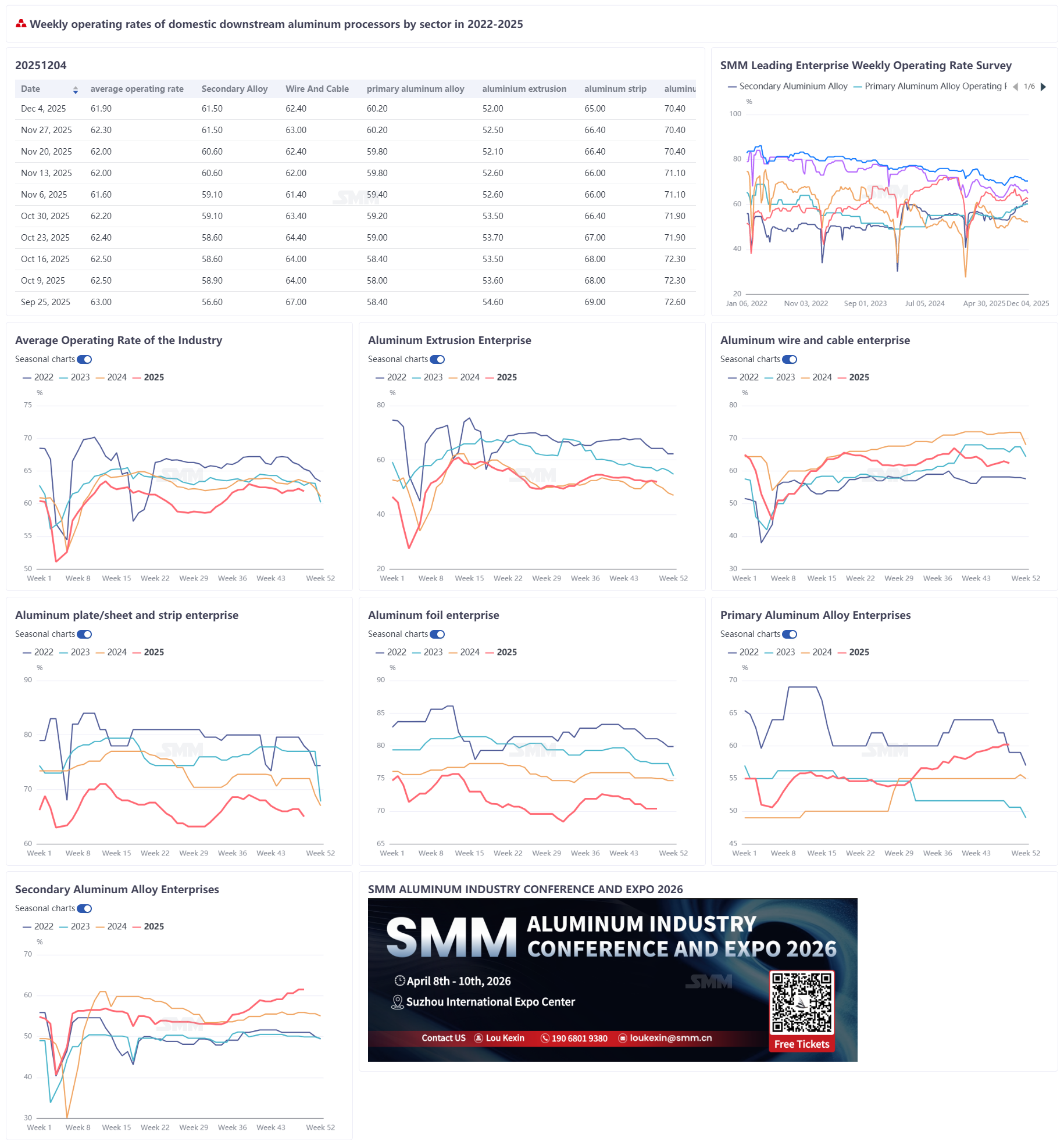 The weekly operating rate of leading domestic aluminum downstream processing enterprises fell 0.4 percentage points WoW to 61.9%, with the market continuing to show structural divergence. The operating rate of primary aluminum alloy remained stable at 60.2%, as long-term contract deliveries at major enterprises were steady, but high aluminum prices suppressed spot order transactions, with cautious demand side sentiment. The operating rate of aluminum wire and cable pulled back 0.6 percentage points to 62.4%; although supported by power grid orders, insufficient cargo pick-up continuity coupled with weak year-end stockpiling willingness constrained the rebound in operating rates. The operating rate of aluminum extrusion edged down 0.5 percentage points to 52.0%, with construction-grade extrusions remaining sluggish and reduced production schedules in the PV sector dragging on industrial-grade materials, while only automotive and ESS extrusions remained stable. The operating rate of aluminum plate/sheet and strip dropped 1.4 percentage points to 65.0%, pressured by intensified environmental protection-driven production restrictions in Henan and other regions and high aluminum prices, leading to a noticeable decline in construction and packaging orders; although can stock processing fees are expected to increase, this is unlikely to reverse the overall weakness. The operating rate of aluminum foil was recorded at 70.4%, with traditional air-conditioner foil and decorative foil demand weakening, while single-zero packaging foil received slight support from year-end stockpiling, and new energy products such as battery foil provided limited incremental demand. The operating rate of secondary aluminum producers held steady at 61.5%, with leading plants maintaining high utilization rates due to sufficient orders, but small and medium-sized producers faced constraints on capacity release due to high aluminum scrap costs and production cuts at die-casting plants. SMM expects the sector's operating rates to continue weakening in the short term, with rates likely to remain weak and consolidate as the off-season deepens and high aluminum prices persist.