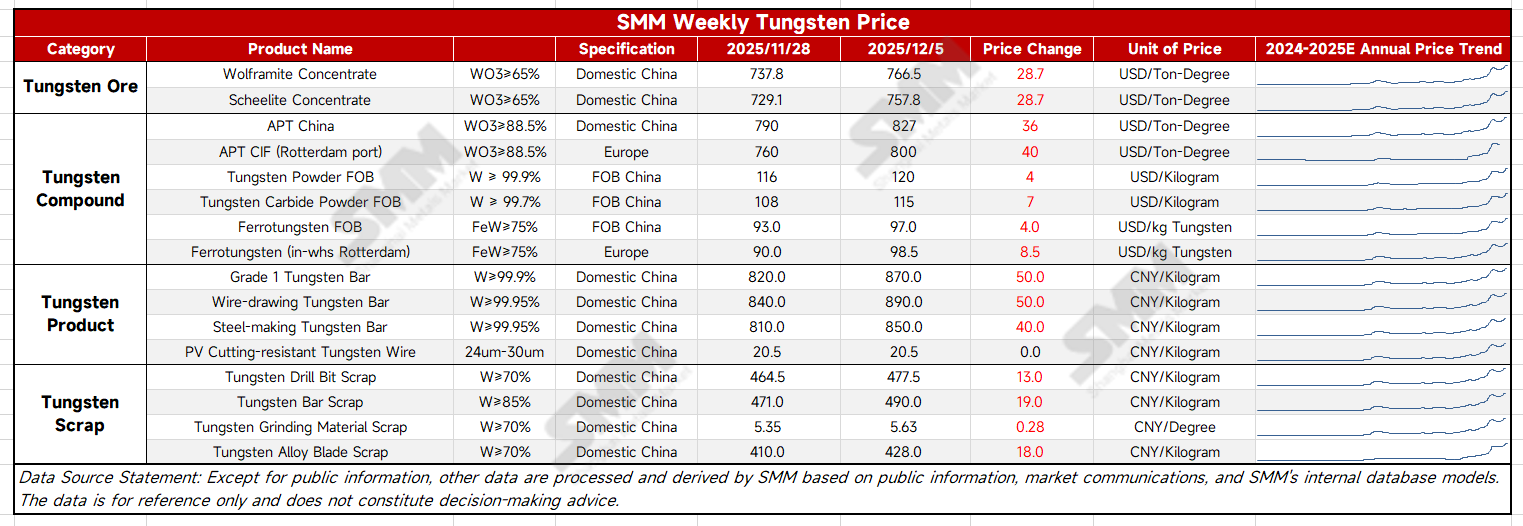 Currently, tradable APT in the European market is extremely limited. According to SMM research, on the raw material side, European APT producers generally rely on long-term contracts with formula-based pricing for tungsten concentrate procurement, resulting in executed prices mostly remaining below $600/mtu. However, as Chinese tungsten concentrate prices have surged to a high of $766/mtu, European market prices for tungsten concentrate have also been forced to adjust accordingly. At the APT level, although the current quotations around $800/mtu reflect market trends, the actual available supply remains scarce, creating an overall pattern of 'prices forced to follow upward trends with limited availability'.