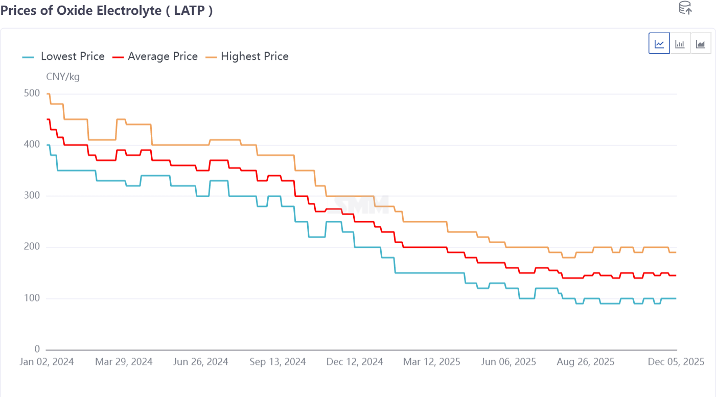 The price of oxide electrolyte LATP experienced a slight decline, with its application still concentrated in the downstream semi-solid battery industry, averaging 145 yuan/kg.