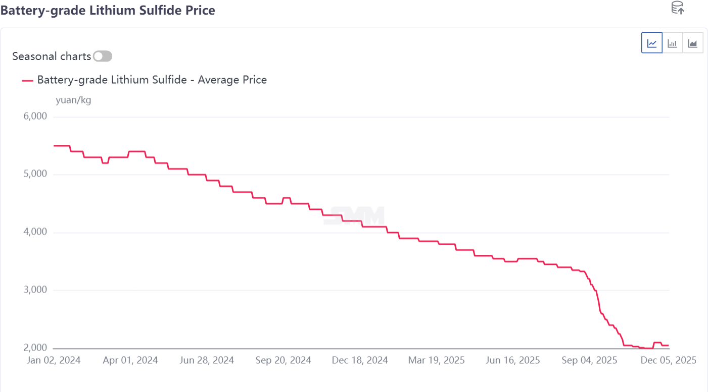 The price of lithium sulfide remained stable with a slight downward trend this week. Market transactions and shipments remained relatively strong, ranging from several tens to hundreds of kilograms, with an average price of 2,050 yuan/kg.