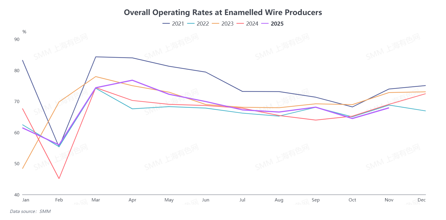 According to SMM, the comprehensive operating rate of the enamelled wire industry in November was 67.91%, up 3.44 percentage points MoM, but down 1.33 percentage points YoY. Among them, the operating rate of large enterprises was 68.38%, that of medium-sized enterprises was 66.05%, and that of small enterprises was 69.29%.