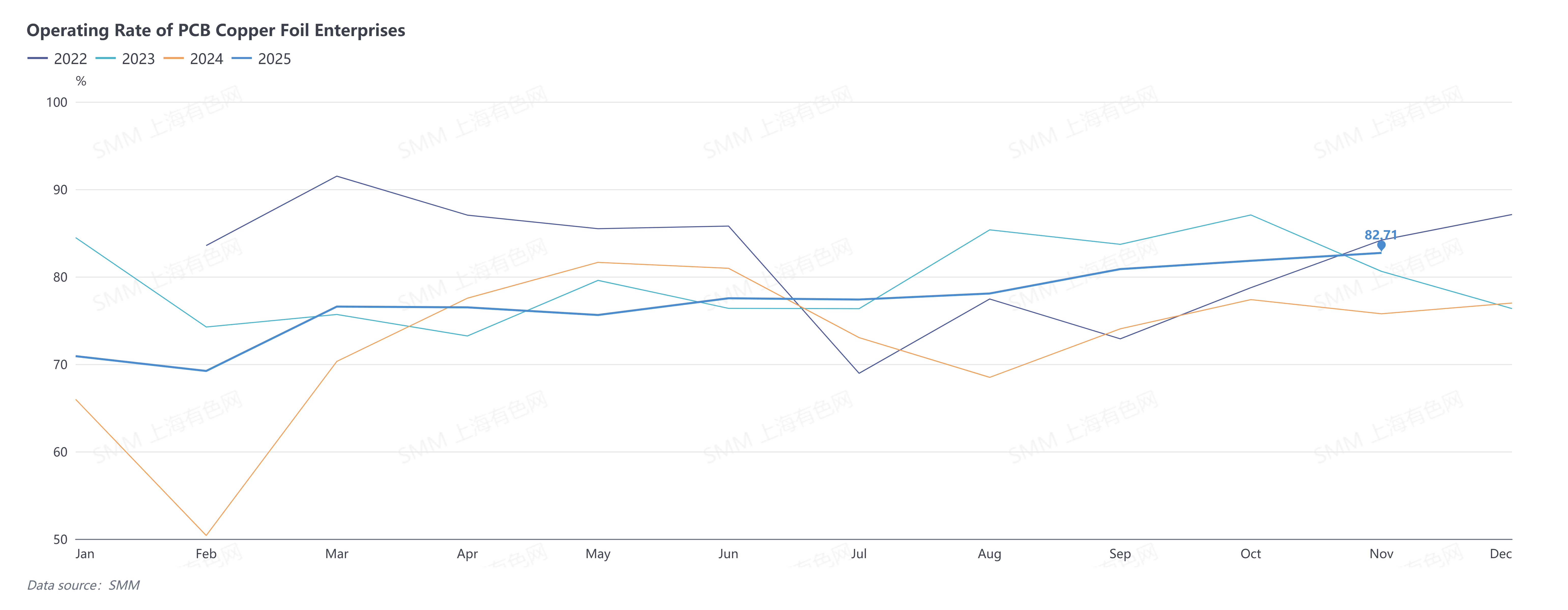 SMM expects the overall operating rate for copper foil enterprises to reach 87.78% in December 2025, up 1.47 percentage points MoM and up 12.14 percentage points YoY. The operating rate for lithium battery copper foil in December is projected at 90.44%, up 2.26 percentage points MoM and up 15.55 percentage points YoY. The operating rate for electronic circuit copper foil in December is forecast at 82.67%, down 0.04 percentage points MoM but up 5.69 percentage points YoY.