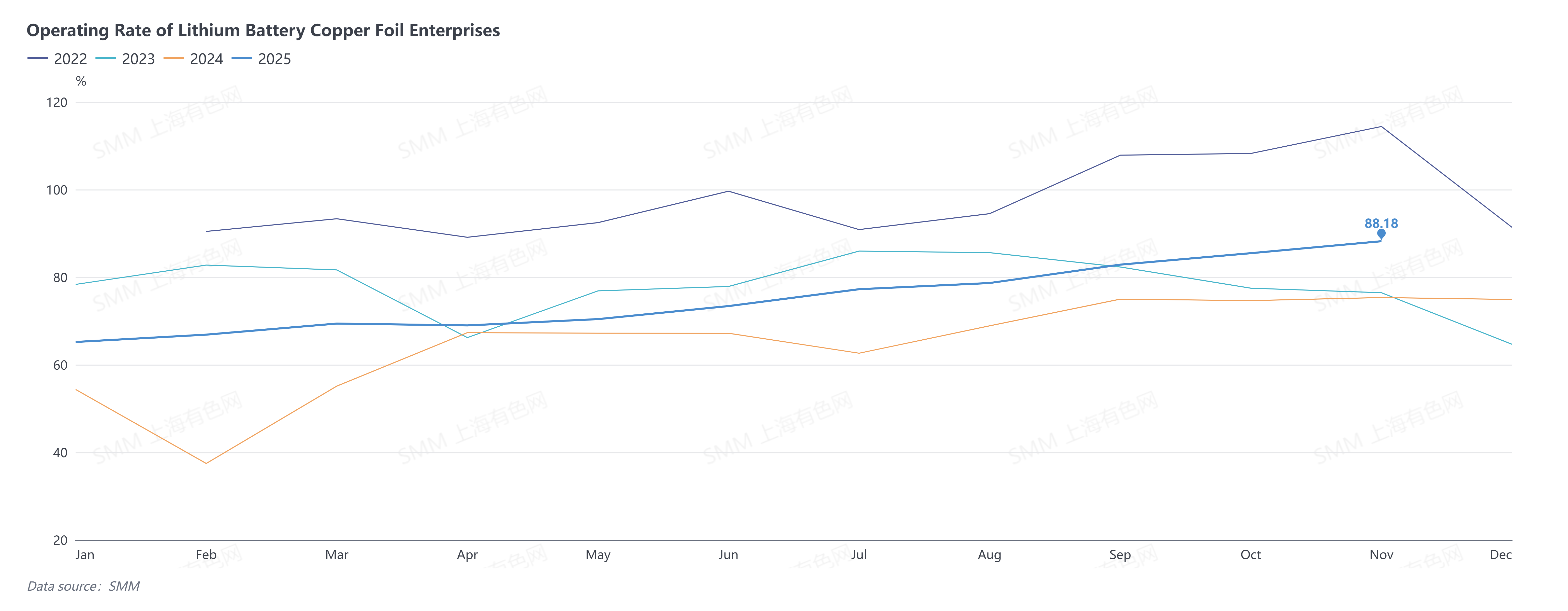 SMM Analysis: In November 2025, the operating rate of Chinese copper foil enterprises was 86.30%, up 2.08 percentage points MoM and up 10.82 percentage points YoY...