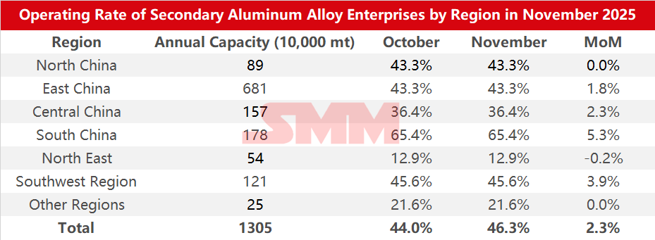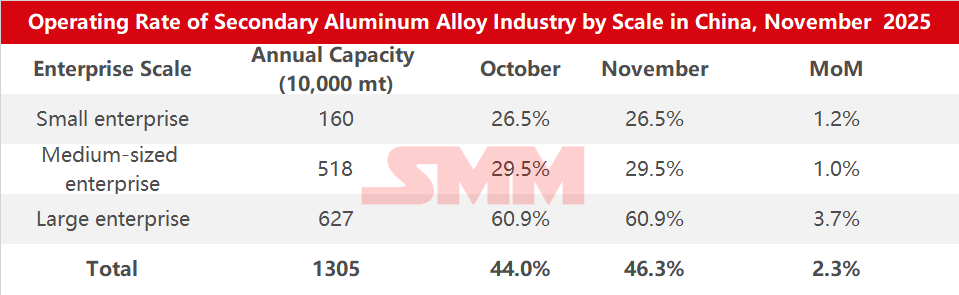 Survey Data on Operating Rates of Secondary Aluminum Alloy Enterprises by Region and Scale in November 2025: