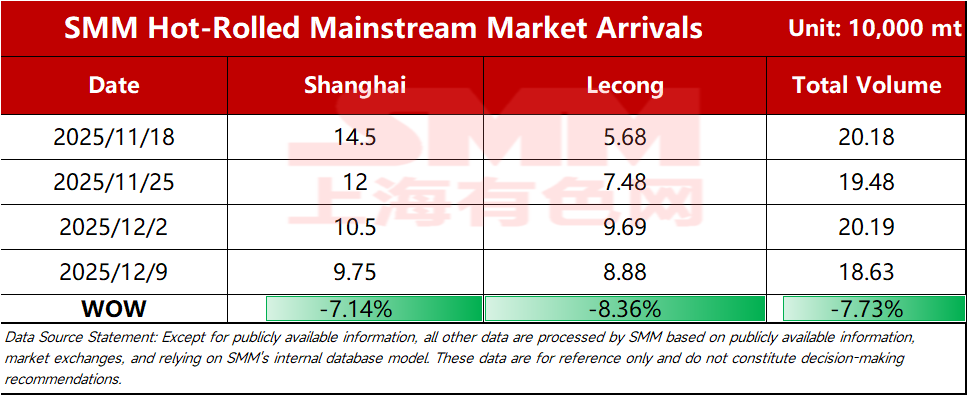 SMM Steel, December 9 – According to SMM statistics, estimated total shipments to mainstream markets this week were 186,300 mt, down 7.73% WoW from last week’s shipment level. By market: