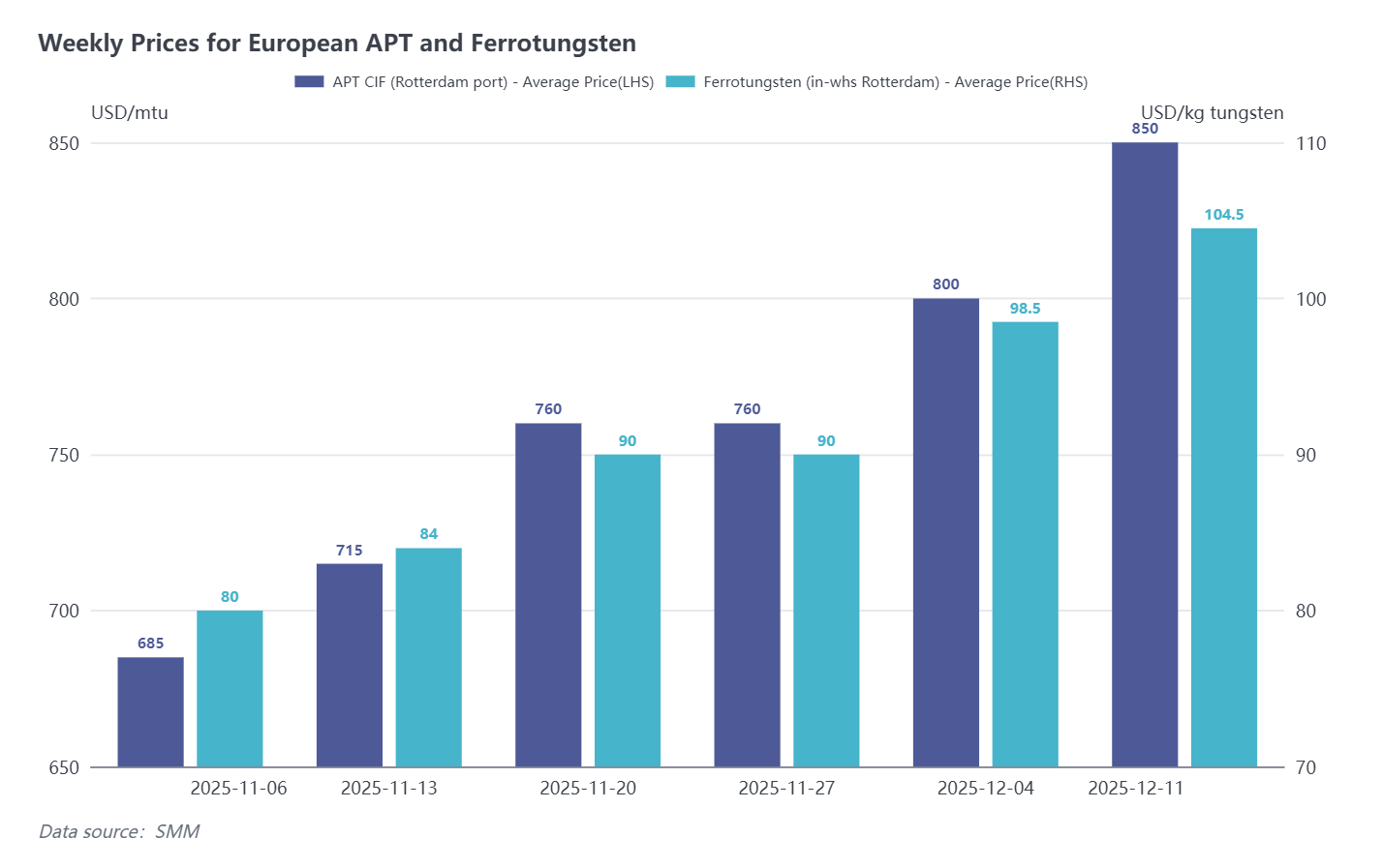 According to SMM data on Dec 12, European APT CIF (Rotterdam) averaged $850/mtu, up $50 weekly, while ferrotungsten rose to $104.5/kg W. Following China’s price surge, severe material shortages and pre‑Christmas production halts have nearly stalled European trading. Traders expect APT quotes to surpass $1,000/mtu, already accepted by some buyers. In China, depleted mining quotas and output cuts pushed domestic APT to 555,000 yuan/ton. Export controls and lengthy approvals are limiting outbound flows, tightening domestic supply. With Europe’s structural shortage and strong demand unresolved, prices are likely to continue climbing.