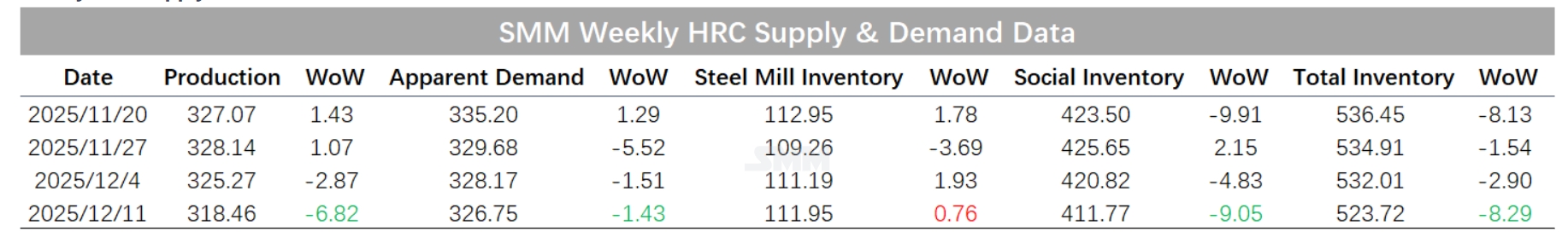 SMM released its weekly HRC balance sheet: scheduled maintenance at mills increases in December, so HRC production is expected to fall MoM. This week SMM tallied 4.1177 million mt of HRC social inventory at 86 warehouses nationwide (large sample), down 90,500 mt (-2.15%) WoW and up 37.59% YoY. National destocking continued; by region, the Northeast, East China and Central China markets posted larger declines.