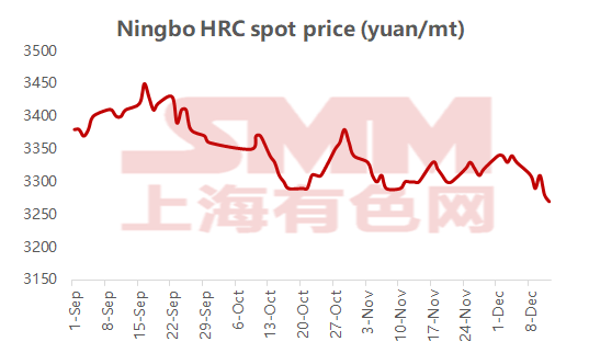 This week HRC prices fluctuated downward; spot prices fell 40-90 yuan/mt WoW, and overall market sentiment stayed weak. By the 12.12 afternoon close, the most-traded HRC 2605 contract settled at 3,232 yuan/mt.