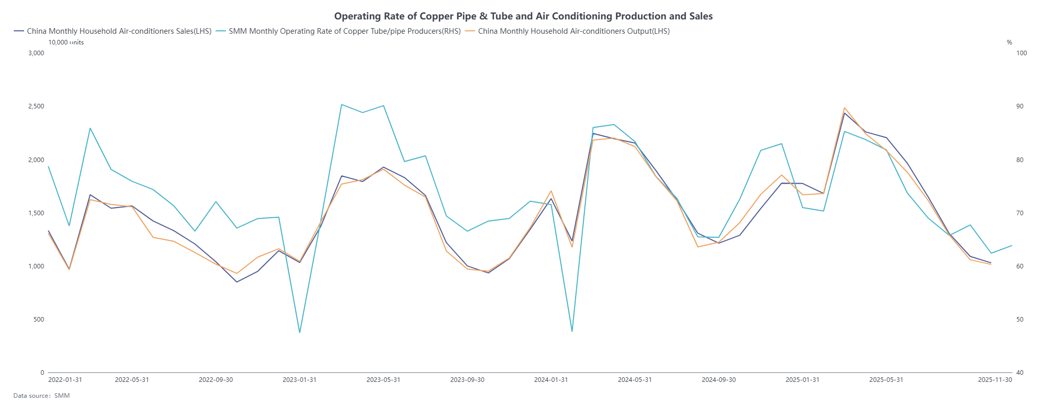 SMM expects the operating rate of copper pipe & tube enterprises to be 67.09% in December, up 3.27 percentage points MoM but down 15.85 percentage points YoY. The operating rate is projected to continue its MoM rebound in December, with the YoY decline narrowing compared to November. According to ChinaIOL data, the production schedules for household air conditioners in December 2025 are 5.16 million units for domestic sales and 8.95 million units for exports, down 29.9% and 11.4% YoY, respectively. Due to the impact of US tariff hikes on copper pipe & tube, China's copper pipe & tube exports also showed a YoY decline in Q4.