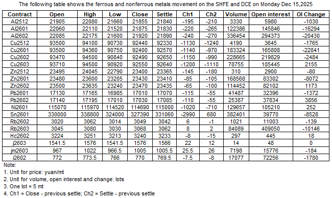 The following table shows the ferrous and nonferrous metals movement on the SHFE and DCE on 15 Dec , 2025