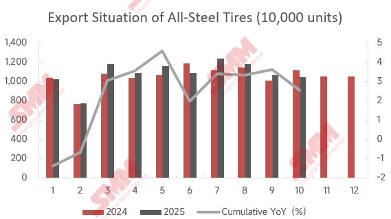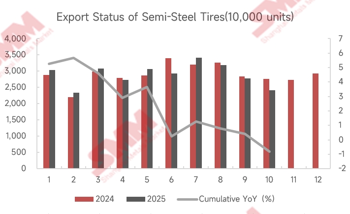 From the perspective of this year's exports of truck and bus radial (TBR) tires and passenger car radial (PCR) tires, as of October, China's cumulative exports of TBR tires reached 108.26 million units, while cumulative exports of PCR tires reached 289.79 million units, with YoY growth rates of 2.56% and -0.82%, respectively. PCR tire exports showed some weakness compared to the previous year.