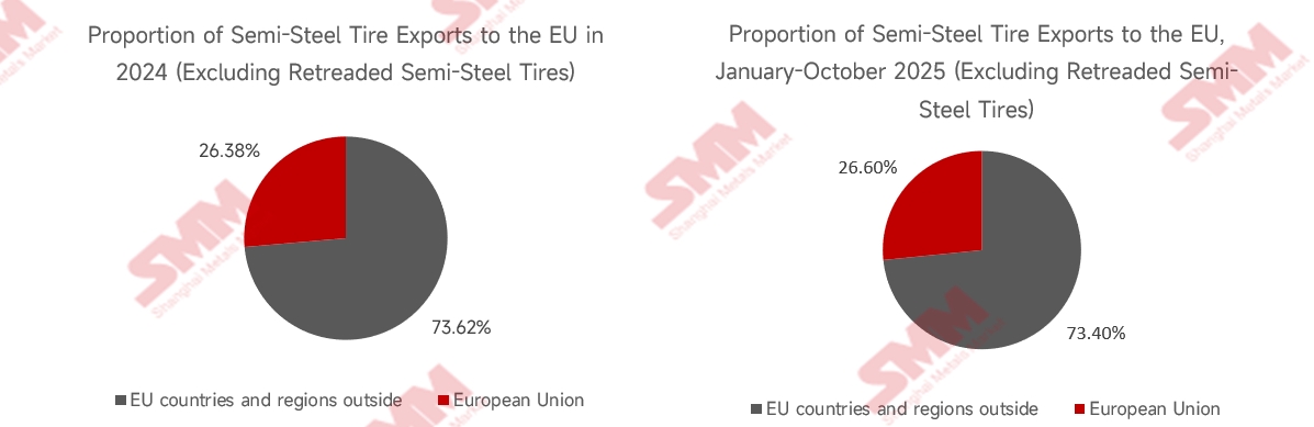 According to customs data, 26.38% of the semi-steel tires exported by China in 2024 were shipped to the European Union region. From January to October 2025, domestic exports of semi-steel tires to the EU reached 76.68 million units, with the proportion rising again to over 26%, reaching 26.6%.