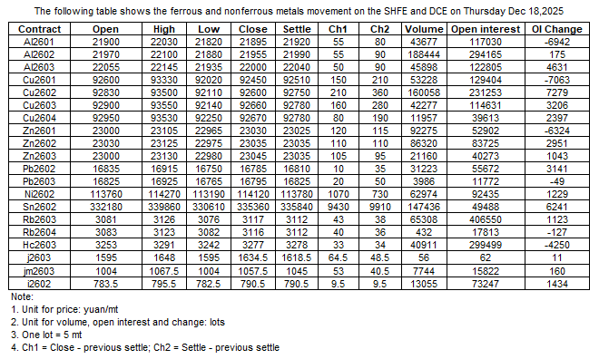 The following table shows the ferrous and nonferrous metals movement on the SHFE and DCE on 18 Dec , 2025
